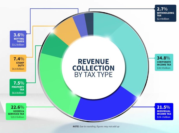 Goods & Services Tax (GST) was the second-largest contributor at 22.6% ($20.0 billion), up from $16.6 billion in the previous FY. The increase reflected higher consumer spending and the adjustment in the GST rate.