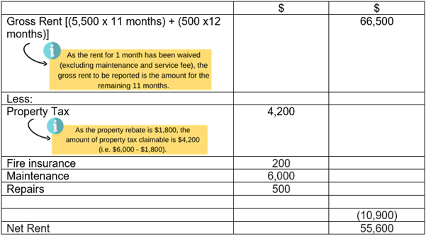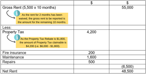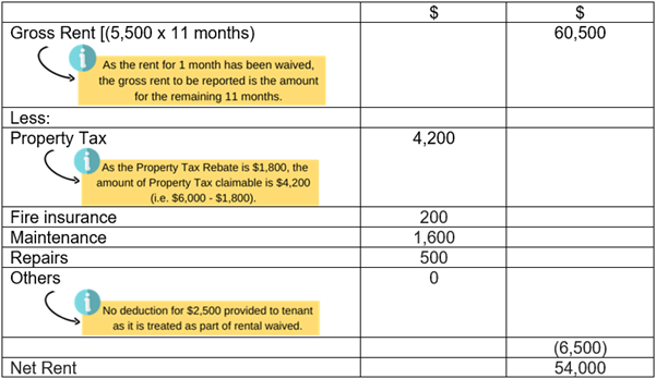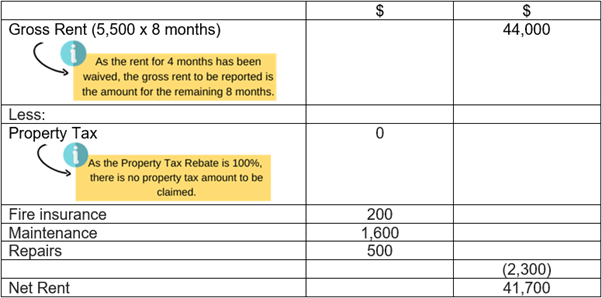 - As the landlord has passed on the Property Tax Rebate of $5,000 to tenant, he has waived a further amount of $17,000 (i.e. $5,500 x 4 - $5,000) of rent for year 2020, making it a total of $22,000.