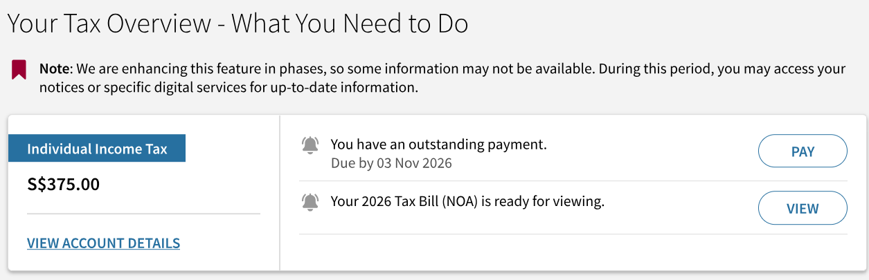 You will receive your tax bill from mid Mar. Please check your tax bill to ensure it is accurate. If it is incorrect, please file an amendment using the 'Amend Tax Bill' digital service at myTax Portal within 30 days.